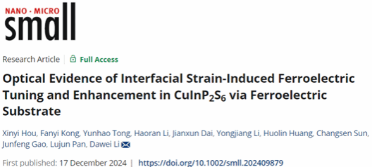 鉴于此,李大卫教授团队采用光致发光(PL)光谱、压电力显微镜(PFM)和密度泛函理论(DFT)计算相结合的方法,阐明了基于铁电衬底的界面应变诱导CIPS中铁电调控与增强。PFM测试发现,薄层CIPS纳米片形成了与PZT和P(VDF-TrFE)铁电薄膜相同的畴结构,表明通过铁电衬底增强了CIPS的极化取向。PL光谱结合DFT计算分析显示,与在一般衬底上CIPS相比,在铁电衬底上CIPS的PL发射峰出现了显著的红移(高达0.21eV),从而揭示了界面拉伸应变诱导的CIPS晶格变化。通过比较分析PZT和CIPS/PZT上的单层MoS2的PL光谱,证明了CIPS的极化取向与铁电衬底的极化取向是反向对齐关系。原位变温PL光谱研究表明,在铁电衬底上的薄层CIPS表现出增强的TC (>200℃)。相关研究成果以“基于铁电衬底的界面应变诱导CuInP2S6中铁电调控与增强的实验证明”(Optical Evidence of Interfacial Strain-Induced Ferroelectric Tuning and Enhancement in CuInP2S6 via Ferroelectric Substrate)为题,发表在《微尺度》(Small)(2024, 2409879. 影响因子: 13.0),我校光仪学院硕士生侯心怡为第一作者,李大卫教授为通讯作者。