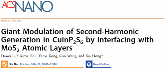 鉴于此,大连理工大学李大卫教授团队与美国内布拉斯加林肯大学洪霞教授团队合作,率先在CIPS及其与单层MoS2异质结构中观察到巨大且可调的二次谐波(SHG)响应。研究表明,CIPS在从少层到块体的厚度范围内均表现出强烈的SHG响应,且各向异性显著,表明其非中心对称结构的有效性。通过与单层MoS2形成异质结界面,实现了对CIPS中SHG响应的强调控,表明CIPS/二维半导体异质结构在非线性光学应用中的巨大潜力。通过结合偏振、温度和厚度依赖的SHG和光致发光光谱分析,揭示了CIPS/MoS2异质结构中SHG信号的调控机制主要来源于光吸收介导界面耦合,而非材料极性对称性,这一发现为理解和设计新型非线性光电材料与器件提供了新视角。相关研究成果以“单层MoS2界面诱导范德华层状铁电CuInP2S6二次谐波响应巨大调控”(Giant Modulation of Second-Harmonic Generation in CuInP2S6 by Interfacing with MoS2 Atomic Layers)为题发表在《美国化学学会纳米杂志》(ACS Nano)(2024, 18, 32890. 影响因子: 17.1),我校光仪学院硕士生侯心怡为(除导师外)第一作者,李大卫教授、洪霞教授为通讯作者。