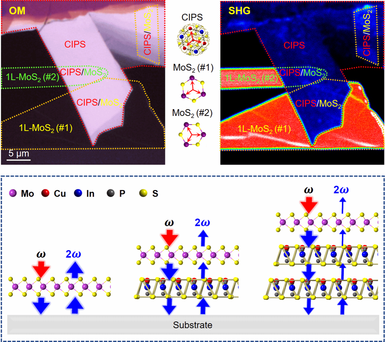 CIPS作为一种具有室温以上居里温度(TC)的vdW层状铁电材料,展现出强大的电学和光学特性。CIPS可与其他vdW材料形成铁电异质结构,使其在多功能和可重构光电器件领域中具有巨大应用前景,例如非易失性存储器、负电容晶体管、铁电二极管和隧道结等。然而,关于CIPS及其异质结构的非线性光学响应研究仍较为有限。因此,如何实现CIPS及其异质结构中的非线性光学响应探测与调控,对于理解vdW铁电非线性光学性质,以及实现vdW铁电异质结构在纳尺度非线性光学调制器、光信息存储和非线性光学成像中的应用,具有重要的科学和应用价值。