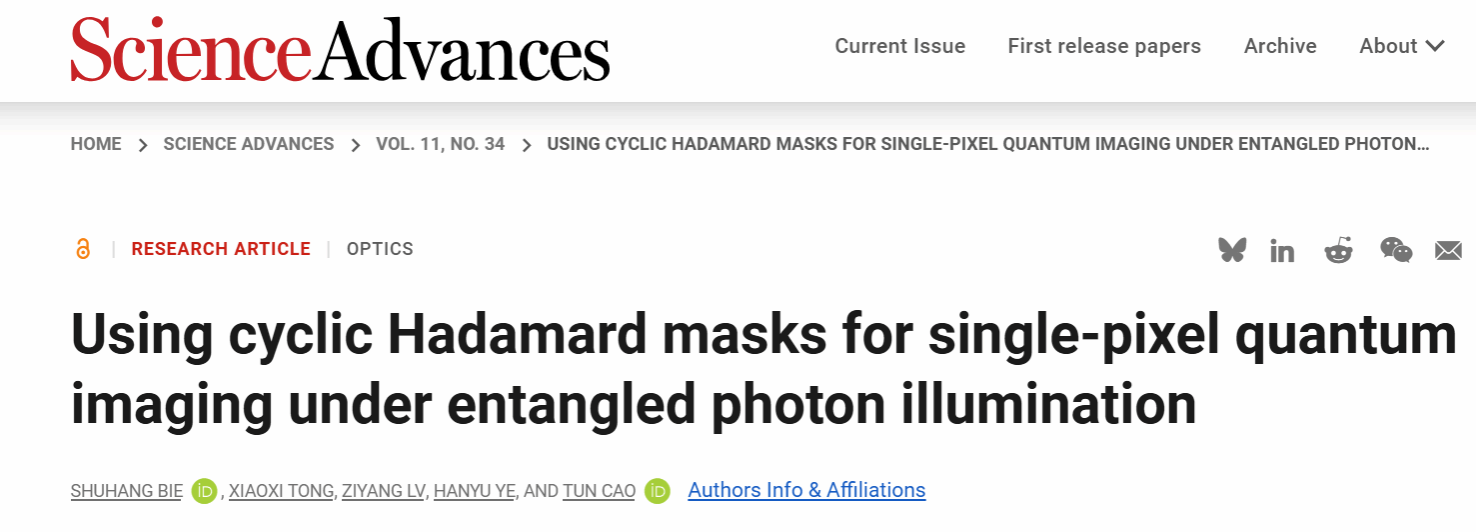 大连理工大学光电工程与仪器科学学院曹暾教授课题组在量子成像领域取得重要突破。创新性地将基于循环哈达玛掩膜的计算成像技术应用于纠缠光子照明下的量子成像系统,成功实现了在极黑、极冷及高噪声等极端环境下的清晰目标成像。该项研究成果以“Using cyclic Hadamard masks for single-pixel quantum imaging under entangled photon illumination”为题,于2025年8月20日正式发表于国际权威期刊《Science Advances》。