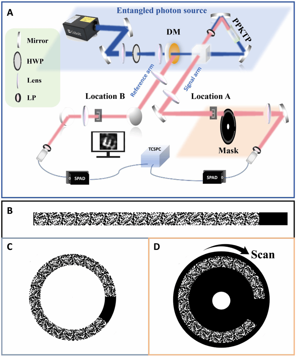 基于上述背景,课题组开发了一种新型量子成像系统。该系统通过非线性周期极化晶体,基于自发参量下转换过程产生高亮度量子照明纠缠光源,为成像提供“量子照明”。该系统的关键创新在于引入了旋转掩模结合循环哈达玛编码模式,并采用单光子探测器,替代了传统量子成像中昂贵且复杂的信号放大与同步设备,大幅降低了系统成本与复杂度。