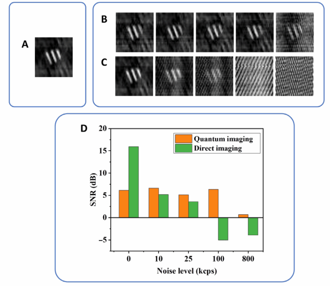 (C)直接成像方法重建的图像(从左至右呈现)。(D)对应不同噪声水平下量子成像和直接成像所重建图像的信噪比。