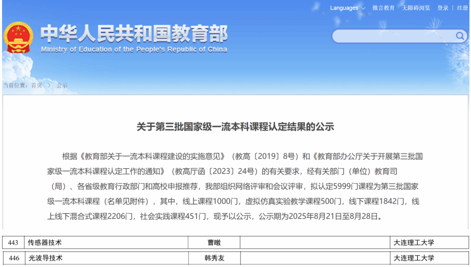 近日,教育部公布了第三批国家级一流本科课程认定结果。我院曹暾教授主讲的《传感器技术》和韩秀友教授主讲的《光波导技术》成功入选,荣获“国家级一流本科课程”称号。此次突破,实现了我院在该类国家级本科教学质量工程项目中零的突破,标志着学院本科课程建设迈上了新台阶。