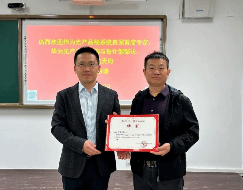 2025年10月17日下午,华为光产品线系统资深首席专家、华为光产品线架构与设计部部长、校友常天海应邀来校为“智能基座”共建课程《全光通信技术》授课。课前,学院副院长韩秀友为常天海颁发了大连理工大学-华为“智能基座”课程《全光通信技术》特聘教师的聘书。