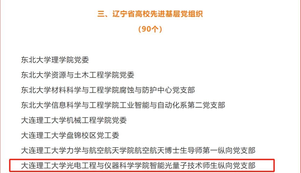 近日,辽宁省教育厅发布《中共辽宁省委教育工作委员会关于表彰辽宁省高校优秀共产党员、优秀党务工作者和先进基层党组织的决定》,光电工程与仪器科学学院智能光量子技术师生纵向党支部荣获“辽宁省高校先进基层党组织”称号。