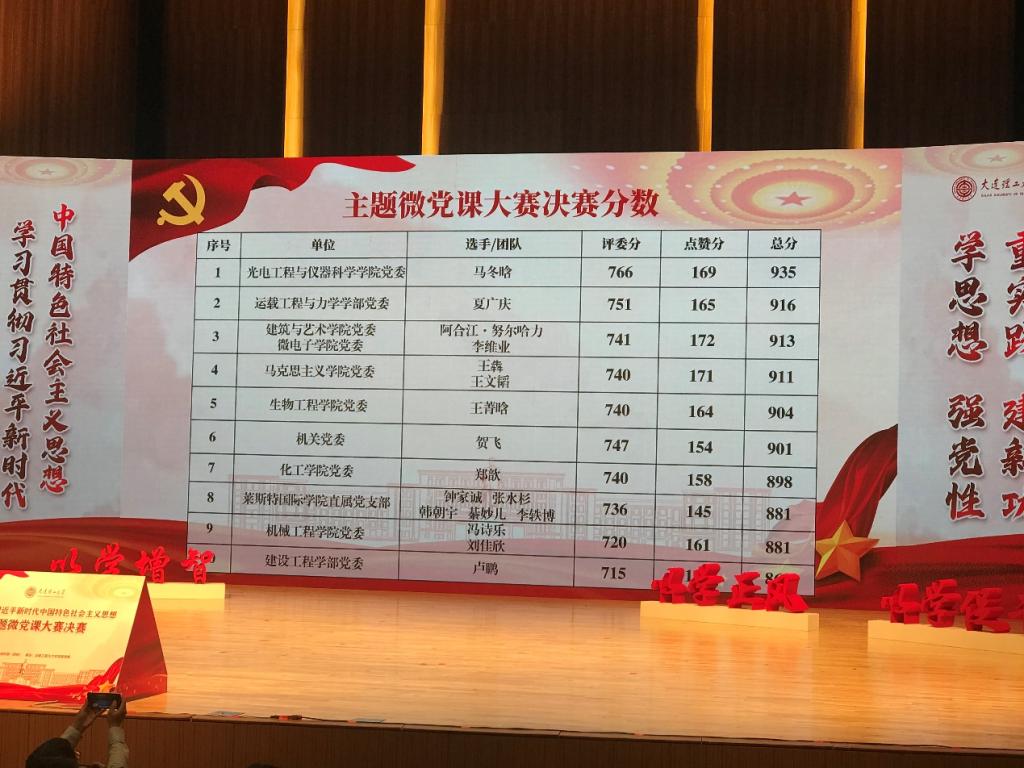5月23日下午,学习贯彻习近平新时代中国特色社会主义思想主题微党课大赛决赛在大连理工大学学生文化中心音乐厅举行。经过激烈角逐,结合现场评委打分、观众投票等环节,最终我院马冬晗教授的微党课《逐梦伟大新时代,海归报国正当时》脱颖而出,以总分935分位列决赛分数榜第一,荣获得大赛一等奖。